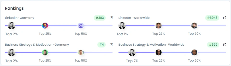 Benjamin has grown from 14,629 to 19,705 followers with consistent upward movement. His Influence Score sits at 6,269 points, placing him in the top 2 percent on LinkedIn Germany. He also ranks in the top 7 percent worldwide in Business Strategy and Motivation. Engagement quality is strong with meaningful discussions and active participation from internal and external networks. His posting rhythm mixes leadership insights with company storytelling.