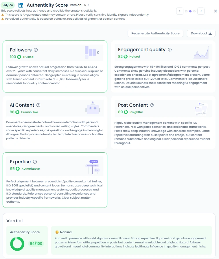 Benoit has a Natural Authenticity Score of 94/100, which reflects his genuine presence. He posts a mix of highly technical content and personal elements, such as a photo of his children on their first day of school, balancing his expert authority with relatable, human experiences. Comments on his posts show strong industry discussion mixed with personal anecdotes and disagreements, indicating a healthy, authentic community. His natural follower growth and meaningful community interaction confirm his legitimate influence in quality management.