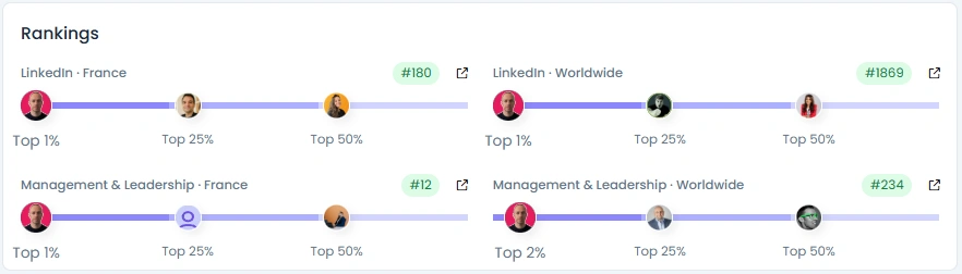 Benoit is a major leader in his specialty, ranked in the Top 1% of all LinkedIn accounts both in France and worldwide. He has an Influence Score of 4 (7,485 pts) and a following of 43.5K. His activity is high, with an average of 26 posts per month. Crucially, he ranks in the Top 1% of Management & Leadership professionals in France and the Top 2% worldwide.