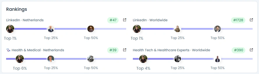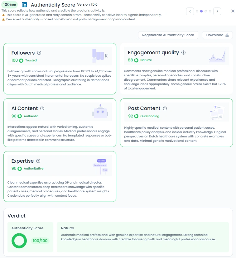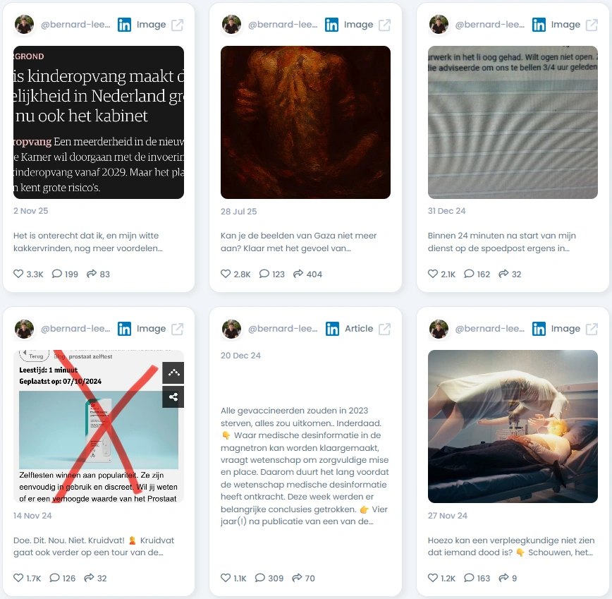 Bernard boasts an Influence Score of 7,148 points, ranking in the top 1% of LinkedIn creators in the Netherlands and top 4% worldwide in Health Tech & Healthcare Experts. His follower base of over 24,000 professionals has grown steadily and organically over the past three years. Engagement remains exceptionally high, with posts often surpassing thousands of reactions and hundreds of comments. His Engagement Quality (88/100) and Post Content (92/100) underline a rare combination of expertise and trustworthiness.