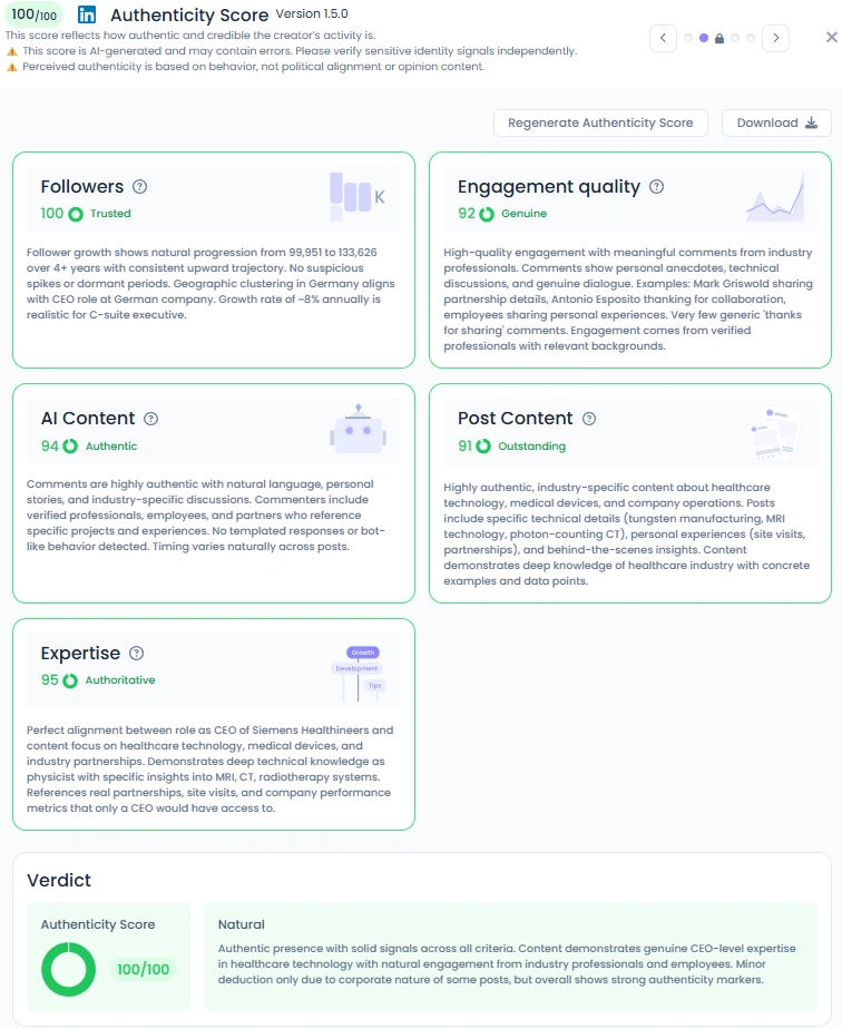 Favikon rates his presence a perfect 100/100 for authenticity. The comments aren’t fluff; they’re from engineers, clinicians, and partners adding context or asking thoughtful questions. He answers with names, places, and details you can verify. That blend of humility and precision builds real trust.