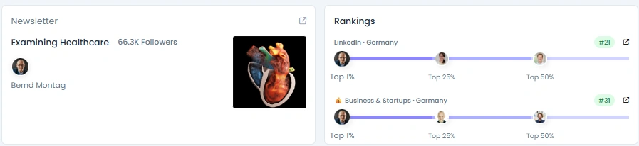 Follower growth has climbed from roughly 100k to 134k over four years with steady momentum. Engagement quality sits in the 90s with consistent professional dialogue. Content quality is flagged “Outstanding,” and expertise clocks in at 95, reflecting deep domain authority. His “Examining Healthcare” newsletter alone reaches 66K readers, extending impact beyond posts.