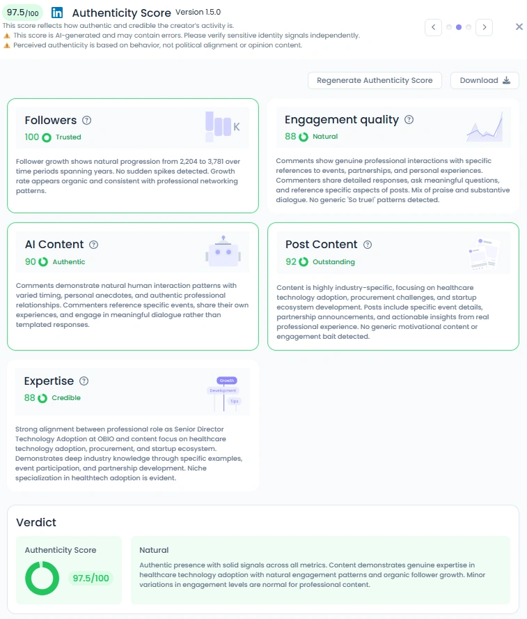 With a Favikon Authenticity Score of 97.5%, his presence stands out for its natural dialogue and meaningful engagement. Comments come from real professionals sharing experiences, asking questions, and referencing shared work. His photos often show him in the middle of teams, smiling, networking, and celebrating others. Nothing feels staged. Everything feels lived and hands-on, which reinforces trust in his voice.