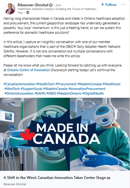 He collaborates closely with OBIO, OntarioMD, HLTH, innovation accelerators, and national procurement programs. His work involves supporting early adopter networks, sharing updates from major innovation summits, and spotlighting Canadian-made health solutions. These collaborations show deep involvement in programs that push technology forward and support the sector’s long-term growth.