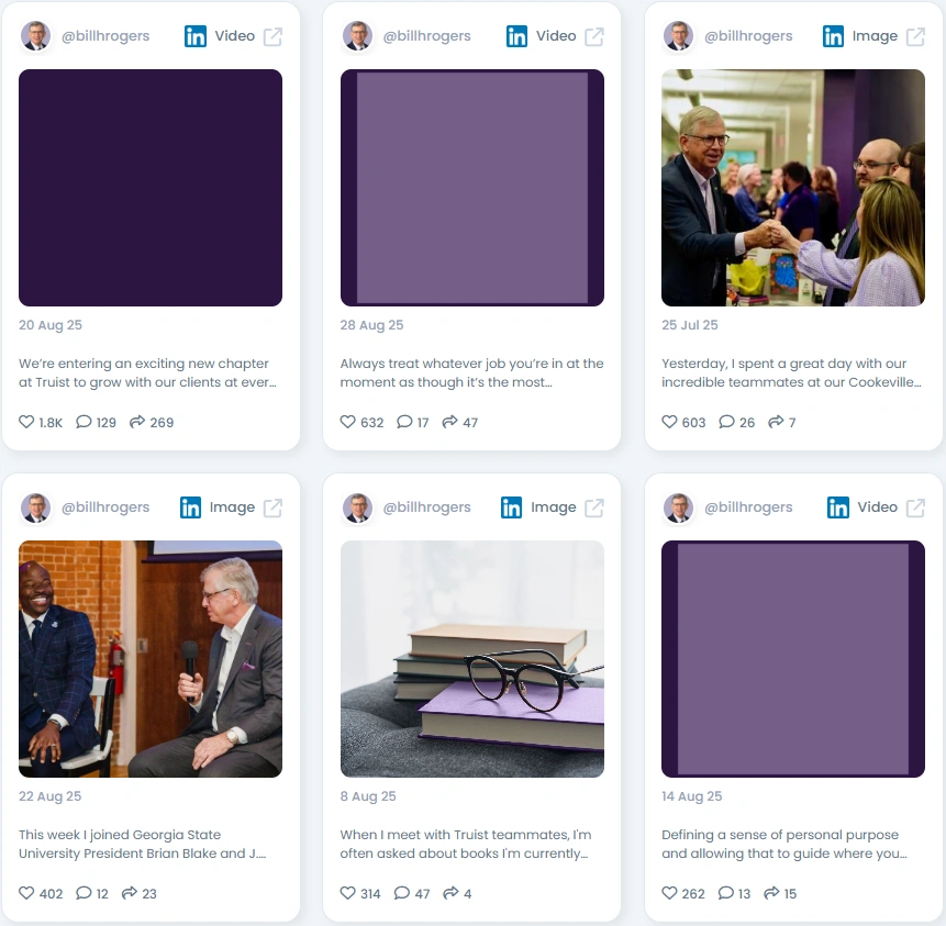 Bill is a purpose-driven CEO who steers Truist with a focus on community impact and client care. His career spans decades in banking and regional leadership, culminating in the creation of Truist and its purpose platform. Online, he translates boardroom strategy into human stories: teammates volunteering, local partnerships, small business wins, and disaster recovery updates. He also champions financial confidence through education initiatives and accessible advice. Bill positions himself as the coach on the sideline, celebrating others and calling the next play that benefits communities.