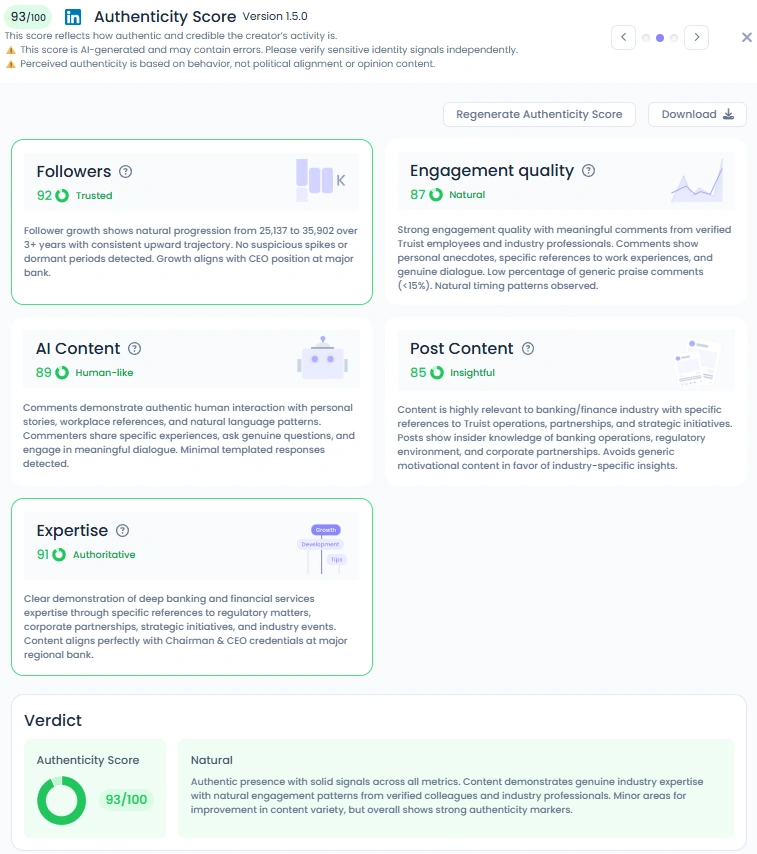 Bill’s Favikon Authenticity Score sits at 93/100. Comments are human, specific, and often from verified colleagues and partners. Posts reference real partnerships, regulatory milestones, and community programs. Tone is “bright” and brand-safe, with minimal politics, which keeps the focus on impact.
