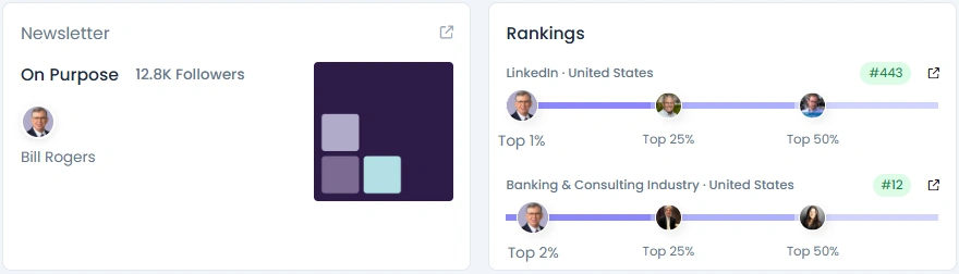 He reaches 35.9K followers on LinkedIn and grows steadily (+2.27% recent trend). Activity averages about 4 posts per month, with 87/100 engagement quality and 85/100 for post content insight. His newsletter “On Purpose” adds 12.8K subscribers, giving him a repeat, high-intent audience.