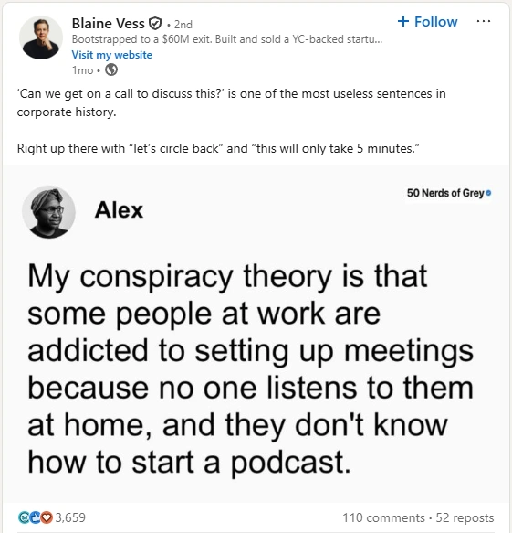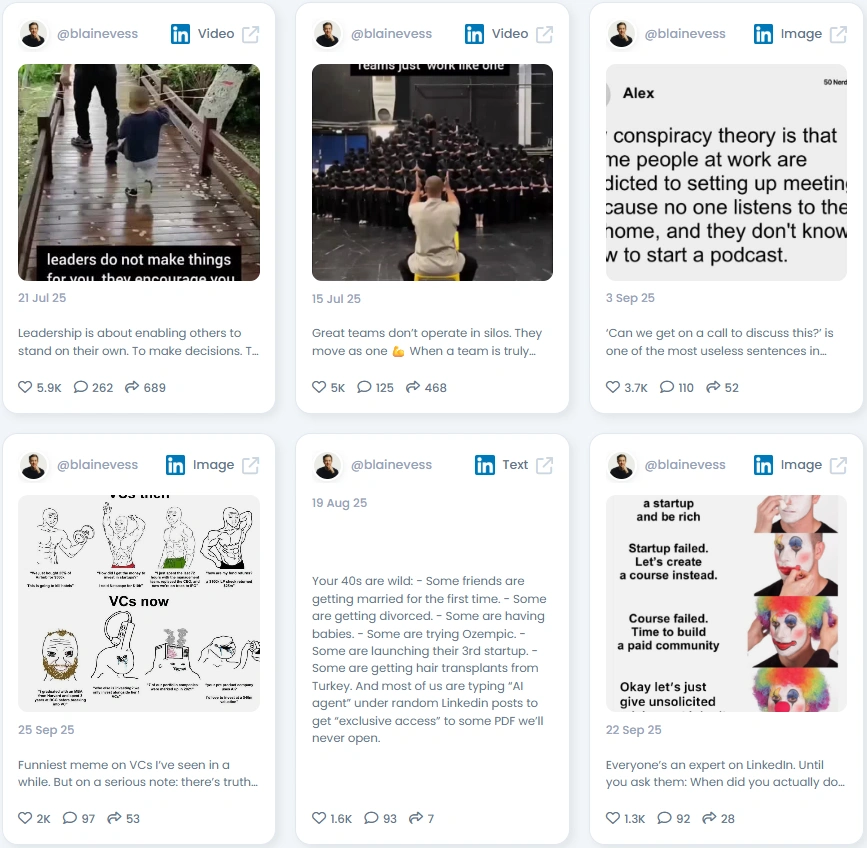 People follow Blaine because he combines experience with humor. His writing feels like advice from a friend who’s “been there,” full of candor and wit. He mixes founder psychology, memes, and viral reflections, often using self-deprecating humor to make serious insights feel accessible. When Blaine says, “Leadership is about enabling others to stand on their own,” it lands because his feed proves he practices what he preaches.