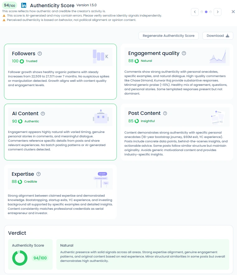 With an Favikon Authenticity Score of 94/100, Blaine’s online presence is a masterclass in keeping it real. His followers see both his wins and his vulnerabilities, from posts about team leadership to memes poking fun at startup culture. Comments on his content aren’t hollow praise; they’re filled with founders and investors sharing their own stories, asking questions, and building conversations. He avoids the corporate tone completely, letting humor and humility drive engagement. His authenticity shows that even after an exit, he’s still a founder at heart.