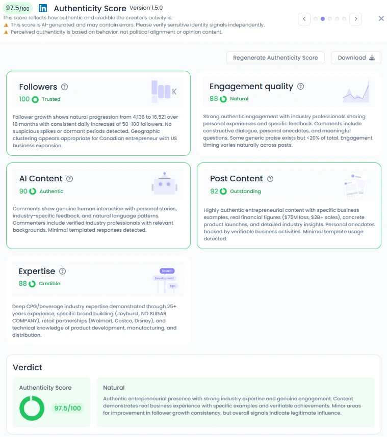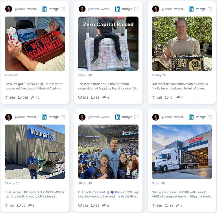 Brad’s following has grown from 4,136 to 16,521 on LinkedIn, showing steady and organic growth. His Influence Score of 6,561 points places him in the Top 1% in Canada and Top 9% globally in Startups and Entrepreneurship. He maintains an impressive Engagement Quality of 88/100, with meaningful discussions across business and retail topics. His posts regularly feature verifiable milestones, from launching new products in Walmart and Costco to sharing sales achievements surpassing $2 billion.