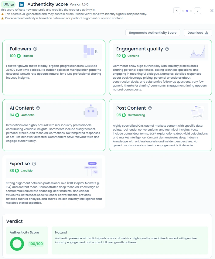 Favikon Authenticity Score: 100/100. Comments show genuine debate from industry pros, not generic hype. Writing varies naturally, with personal anecdotes and technical corrections showing up in the threads. His playbook is consistent: real data, real deals, real people.