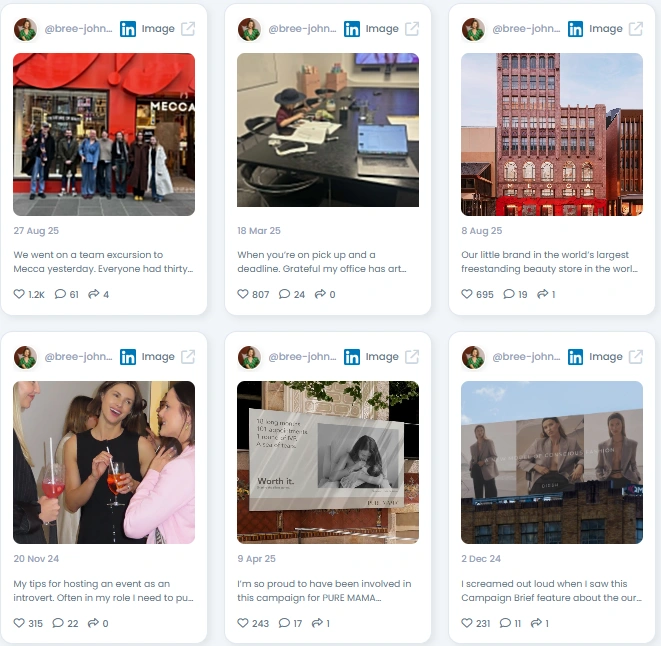 Bree’s orbit spans consumer brands, retailers, and creative leaders. You’ll see MECCA, PureMama, Dish, Campaign Brief, and a cluster of Australian founders and operators. Her world bridges agency, brand, media, and retail, which makes her advice useful on both sides of the table. When she celebrates a launch or a billboard, the partners and producers are right there in the comments.