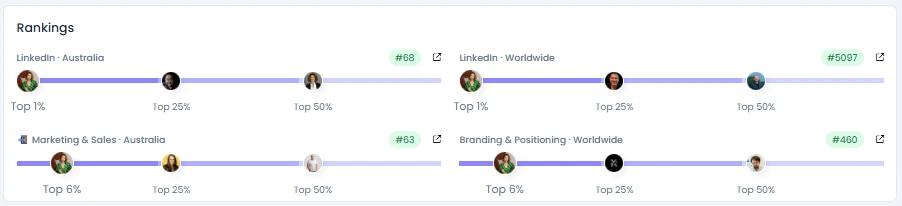 Her audience has grown from 16.8K to 27.2K followers over four years with steady, organic patterns. Engagement quality sits at 88, with real industry dialogue rather than empty praise. Content quality is high, scoring 92 for depth and originality. She ranks in the top 1% for LinkedIn Australia and top 6% in Branding & Positioning worldwide.