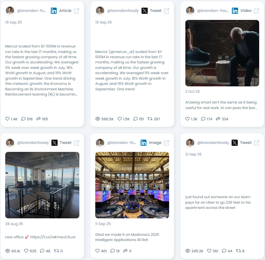 Brendan’s content stands out for its clarity, numbers, and realism. He doesn’t just talk about AI; he explains what it means for businesses and people in concrete terms. His posts blend startup updates, team milestones, and sharp commentary on the state of AI work. The result is a feed that feels both analytical and accessible, pulling in followers who value data as much as direction.
