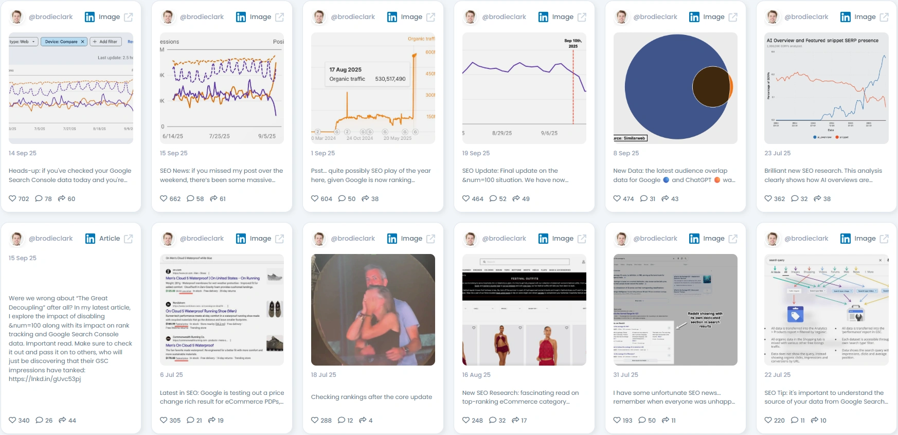 People follow Clark because he explains the complicated in simple terms. His posts do not just share charts. They tell a story about what the data means for everyday marketers. He mixes technical depth with accessibility, making his updates valuable for both SEO professionals and brand managers. That ability to connect across levels has earned him consistent engagement and trust.