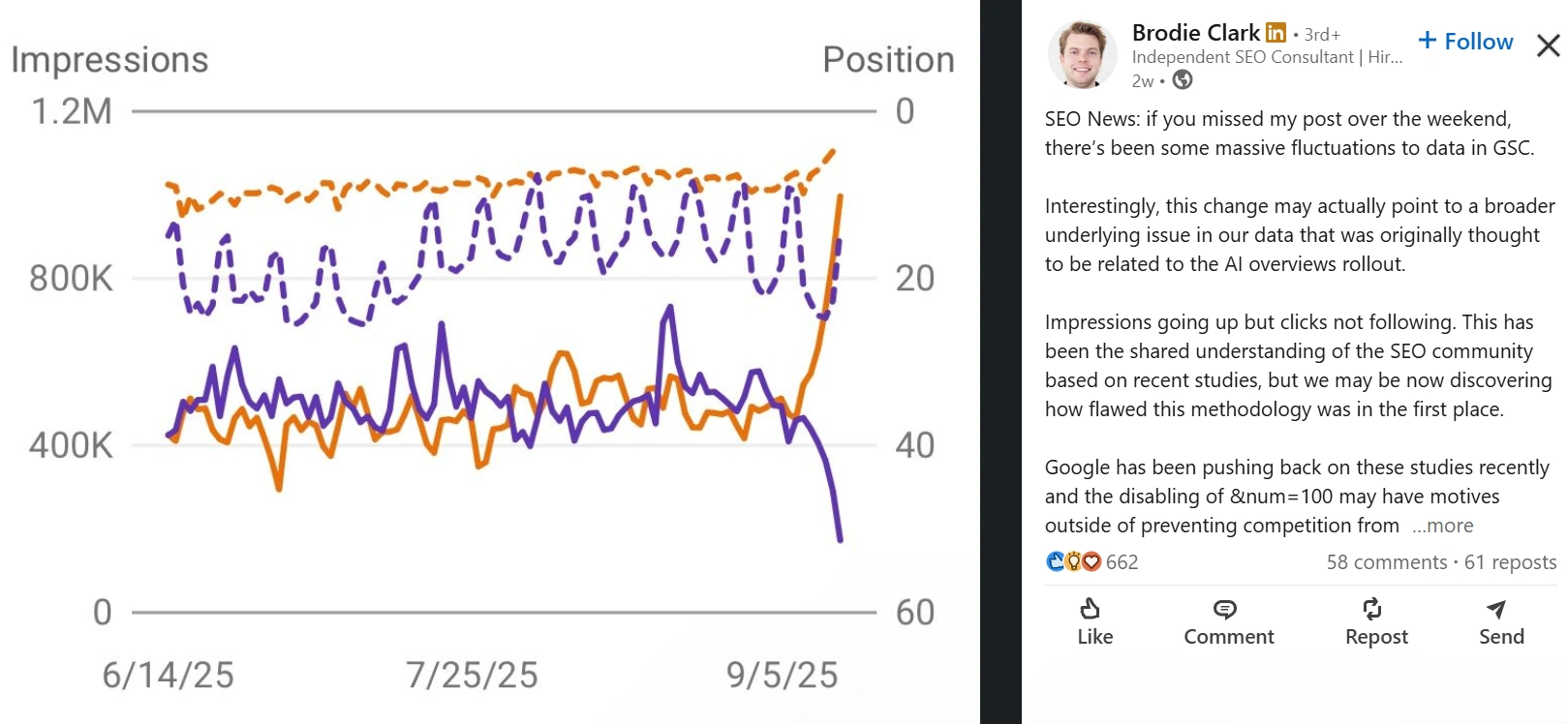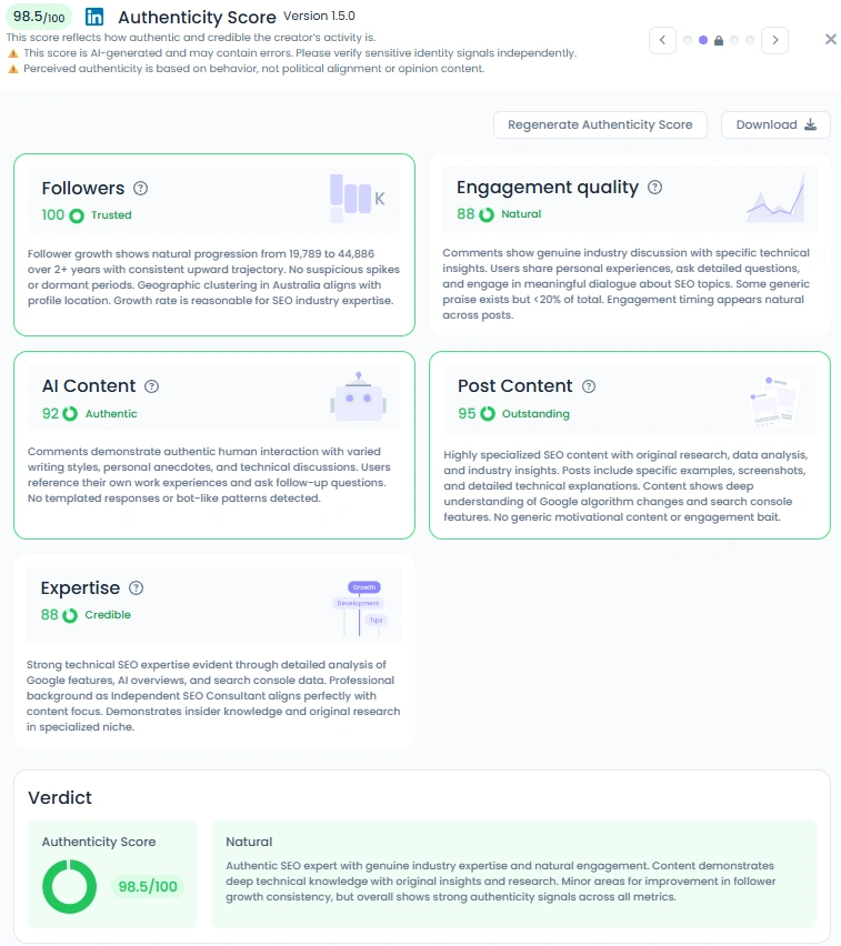 Clark’s Authenticity Score of 98.5/100 shows how strongly his audience values his work. His posts are grounded in real examples, screenshots, and direct data pulls from Google Search Console. Engagement often comes in the form of meaningful discussions with peers, not just surface-level likes. His natural mix of technical rigor and approachable commentary makes him a trusted figure rather than a distant authority.