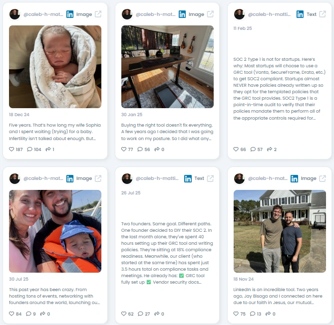 He teaches by example. A post about the right chair becomes a lesson on posture and sustainable work. A SOC 2 thread compares two founders, their hours, and their readiness score. He shares a $700 promoted post that generated a $240k pipeline to show what proof looks like. People engage because he pairs empathy with receipts.