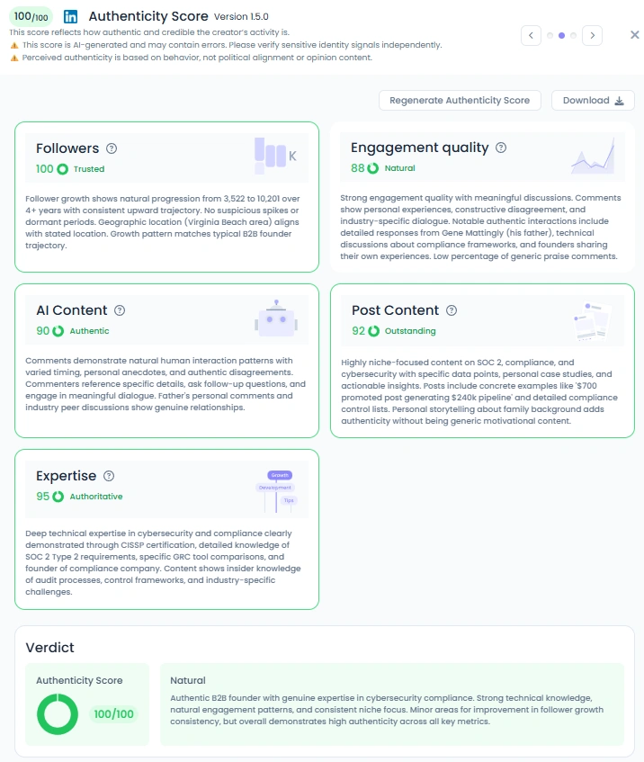 He has 10,201 followers with steady growth from 3,522 over four years. Engagement quality scores 88, with meaningful discussion rather than generic praise. Content quality scores 92 and expertise 95. His Influence Score is 4,140 points, and his rankings place him in strong tiers on LinkedIn in the United States and competitive brackets worldwide for cybersecurity.