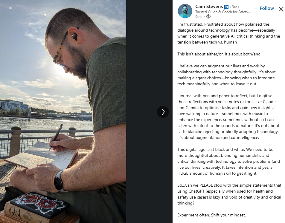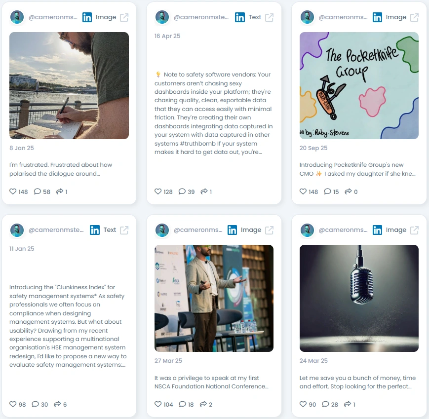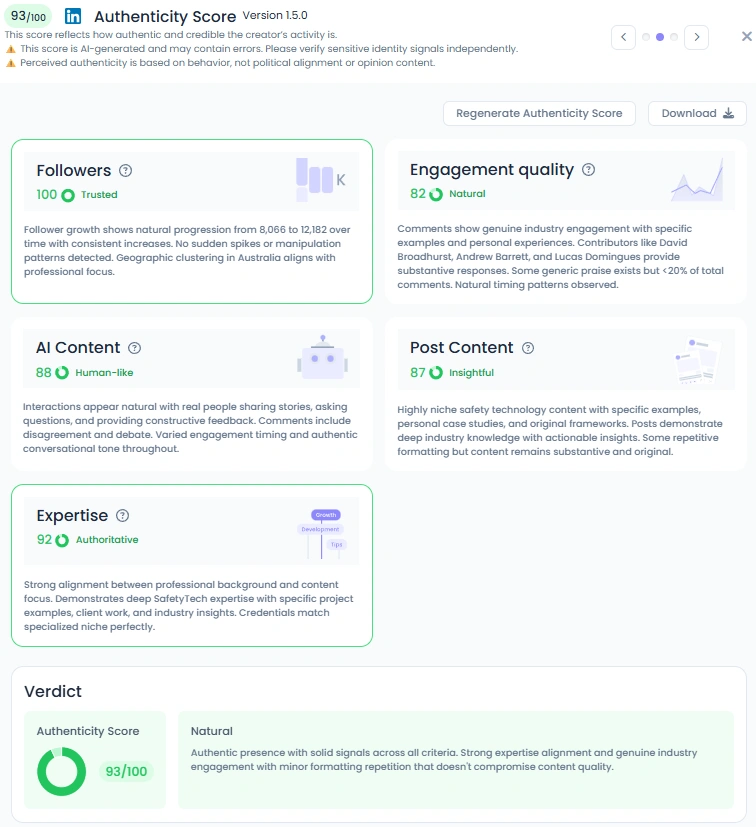 With an Favikon Authenticity Score of 93/100, Cam’s presence feels refreshingly genuine. His posts range from professional frameworks to personal reflections, showing both technical depth and emotional intelligence. The engagement he fosters comes from genuine dialogue, not just likes. His audience challenges ideas, debates approaches, and celebrates progress together. It’s this balance between authority and empathy that sets Cam apart in the SafetyTech space.