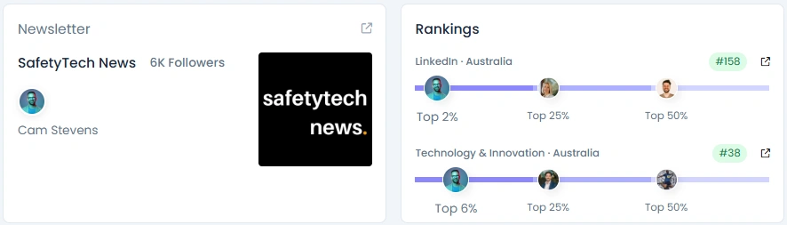 Cam holds an Influence Score of 5,495 points, ranking in the top 2% of LinkedIn creators in Australia and within the top 6% for Technology & Innovation. His follower base has grown organically from 8,000 to over 12,000 professionals, with consistent engagement across posts that regularly exceed 100 interactions. His newsletter, SafetyTech News, amplifies his impact, reaching over 6,000 readers with every edition. His metrics reflect steady, high-quality growth rooted in trust and expertise.