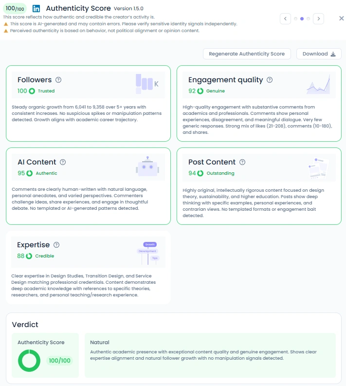 Cameron’s Favikon Authenticity Score is a perfect 100/100, which signals a highly genuine and consistent presence. His content includes original diagrams, academic reflections, and candid commentary. Comments on his posts are substantive and often critical in a constructive way. That pattern shows real intellectual engagement rather than performative signals.
