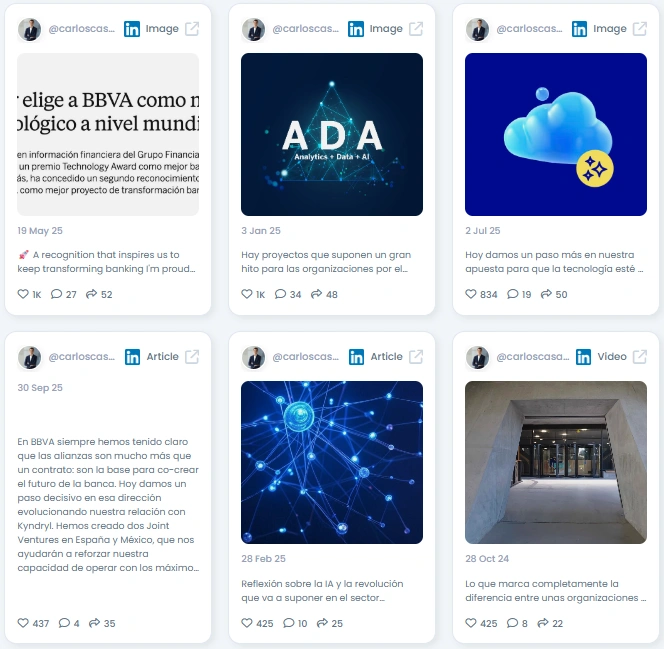 Carlos’s follower base has grown organically from 12,741 to 21,451, with steady engagement across posts. His Influence Score of 6,088 points places him in the Top 1% of LinkedIn creators in Spain and Top 8% in Computer Engineering worldwide. Engagement quality ranks at 82 (Natural), while his Expertise score reaches 88 (Credible). His mix of bilingual content and consistent activity keeps his audience of professionals and tech enthusiasts actively involved in BBVA’s innovation story.