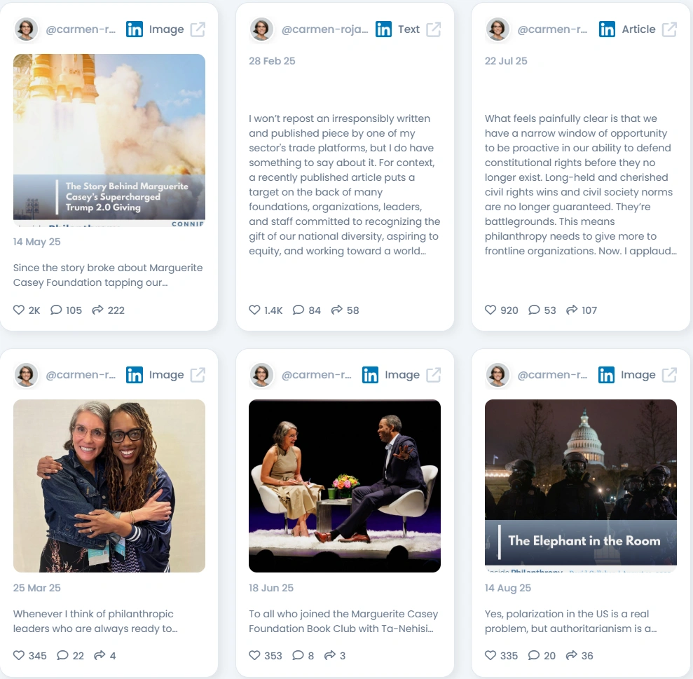 Carmen has over 37,000 followers on LinkedIn, ranking among the top 1% of creators in her field in the U.S. and the top 13% worldwide for Social Justice & Philanthropy. Her engagement quality sits at 88/100, with consistent participation from sector leaders and advocates. She posts around 11 times per month, keeping her audience active and informed, and maintains a +3.87% growth rate, proof of steady and sustained impact.