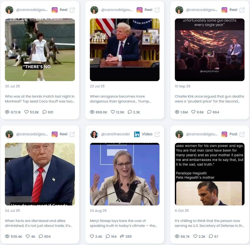 Caroline’s content resonates because she speaks with both intellect and heart. She does not just post statistics about inequality, she humanizes them. Her tone is direct yet compassionate, often weaving data with real stories and cultural reflections. Whether she is calling out political hypocrisy or highlighting a woman breaking barriers, her message always strikes a balance between truth and optimism.