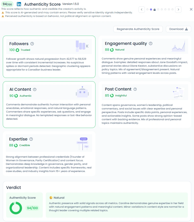 With a Favikon Authenticity Score of 94/100, Caroline’s influence is built on sincerity and consistency. Her engagement shows genuine dialogue rather than surface-level agreement. Comments under her posts often turn into conversations about shared experiences, from corporate bias to climate action. She alternates between serious commentary and empowering content, showing the range of someone deeply connected to both her mission and her audience.