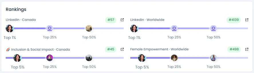 Caroline ranks #57 on LinkedIn Canada and within the Top 1% of creators nationwide, with an Influence Score of 7,890 points. Her following has grown from 42K to over 58K in steady, organic increments. Posts on leadership, governance, and women’s rights frequently surpass half a million views, and her reels often go viral across Instagram and LinkedIn. Her engagement rate remains strong, backed by thoughtful discussions rather than passive reactions.