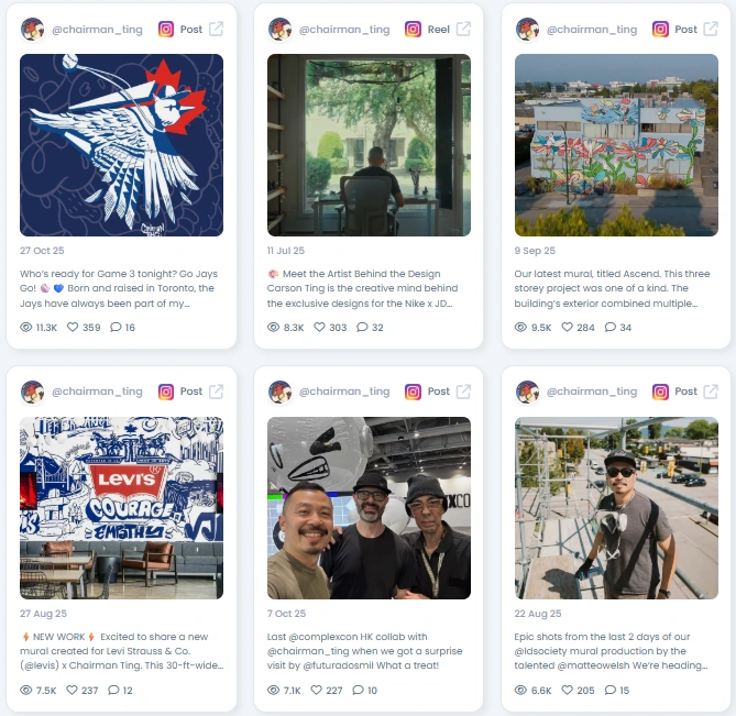 Carson’s content shows how work actually gets made. He shares process videos, studio shots, and project launches that are visually engaging and informative. His posts are artist-forward without being precious, which attracts fellow creatives, brand teams, and fans who want both craft and context. People follow him for inspiration, collaboration cues, and real creative energy.