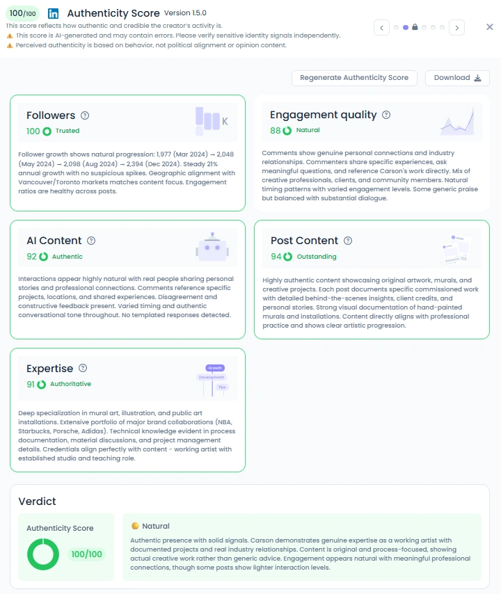 Favikon gives Carson a perfect 100/100 Authenticity Score. His documentation is process-driven and human. Posts include studio photos, crew snapshots on scaffolds, and client reveal moments that feel lived-in and genuine. Comments show specific references to projects and materials, not generic praise, which signals real community engagement and professional relationships.