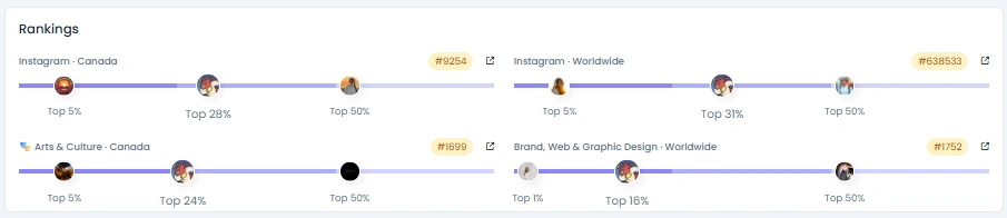 Carson’s social reach shows steady traction, with several posts hitting thousands of views and strong engagement on project announcements. His Influence Score lands in the mid thousands and his Instagram rankings place him in the top tier for Canada in arts and culture. Engagement quality scores high, meaning conversations are substantive and often reference specific work or collaborations. Posting cadence favors major project updates and high-quality process content rather than daily micro-posts.