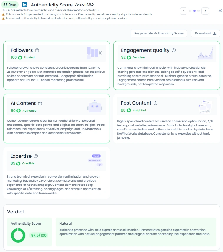 With a strong Favikon Authenticity Score of 97.5/100, Casey’s content reflects genuine expertise and human storytelling. Every post shows his personal touch through original examples, screenshots, and firsthand experience. He focuses on real data and results instead of buzzwords, and his comments often turn into valuable discussions with other marketing professionals. This natural engagement proves that authenticity, when backed by experience, creates lasting impact.