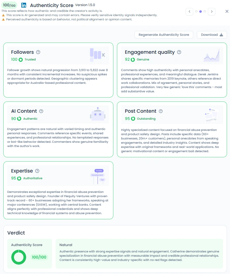 Catherine’s Favikon Authenticity Score of 100/100 reflects her genuine approach to communication. Her posts are transparent and filled with purpose. She shares moments of both professional achievement and personal reflection, from speaking on global stages to honoring her family’s influence on her mission. The dialogue in her comments shows real connection and shared values. She doesn’t post for attention, she posts to educate, connect, and inspire meaningful change.