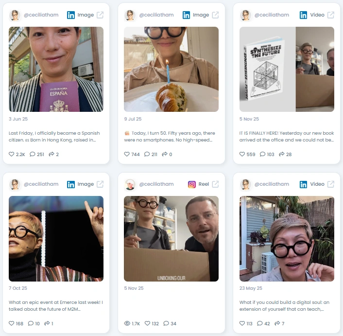 With a 94/100 Authenticity Score, Cecilia proves that expertise and authenticity can coexist. Her posts range from unfiltered selfies at speaking events to personal milestones like citizenship and birthdays. Comments are full of genuine discussions on future tech, not just likes and emojis. One post reflects on the last 50 years of tech while eating a croissant. Another breaks down futures synthesis with a prototype in hand. It’s clear she’s not just posting to post she’s creating content that teaches, questions and connects.