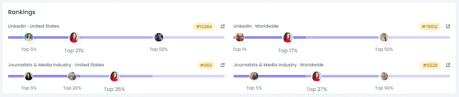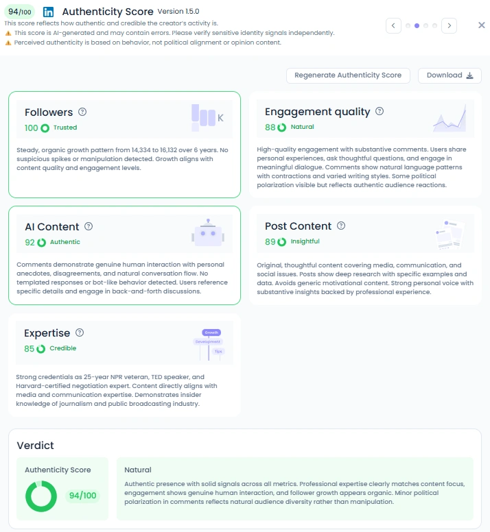 Her audience grew from 14.3K to 16.1K over six years with steady, organic gains. Engagement quality is 88 and post content is 89, driven by thoughtful threads and evidence based takes. Expertise is 85, consistent with a 25 year media career and TED stage presence. Her Influence Score is 5,321 points, reflecting a trusted niche voice with durable reach.