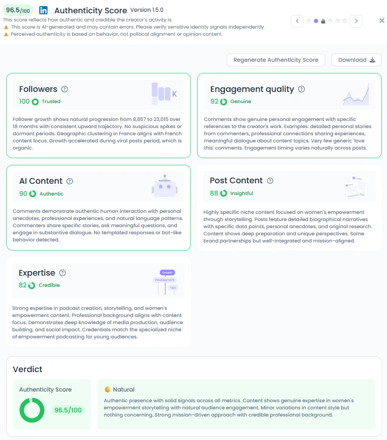 Favikon scores her authenticity at 96.5/100, marked as Natural. The platform finds genuine audience growth, high-quality engagement, and human-driven content. Her posts include researched biographies, personal commentary, and mission-led partnerships. That mix keeps her authoritative but approachable.