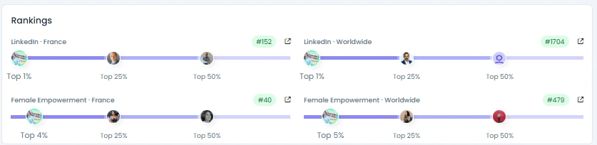 Follower growth looks organic, rising from about 8,800 to 23,000 in 18 months, with viral spikes tied to a few top posts. Individual cards and episodes have reached hundreds of thousands to over a million views. Her Influence Score is around 7,950 points, and rankings place her in the Top 1% on LinkedIn France and strongly in the Female Empowerment category. Engagement quality and AI content authenticity both score in the 90s, showing solid audience trust.