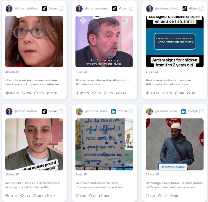 His audience has grown steadily from about 20,625 to 34,114 followers over two plus years, showing organic traction. Engagement quality is high with frequent shares and discussion on video posts. Influence metrics place him solidly in French inclusion circles and give him meaningful reach for campaigns. He posts regularly around awareness days, media moments, and local initiatives.