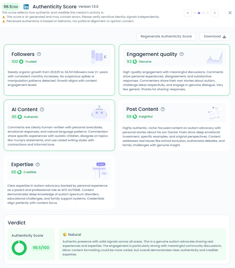 Chams-eddine scores 98.5 out of 100 on Favikon’s Authenticity Score. His feed features heartfelt clips, family snapshots, and community moments that attract genuine responses. Comments include personal stories and constructive debate, not empty praise. That pattern shows an engaged community and a creator who genuinely connects.