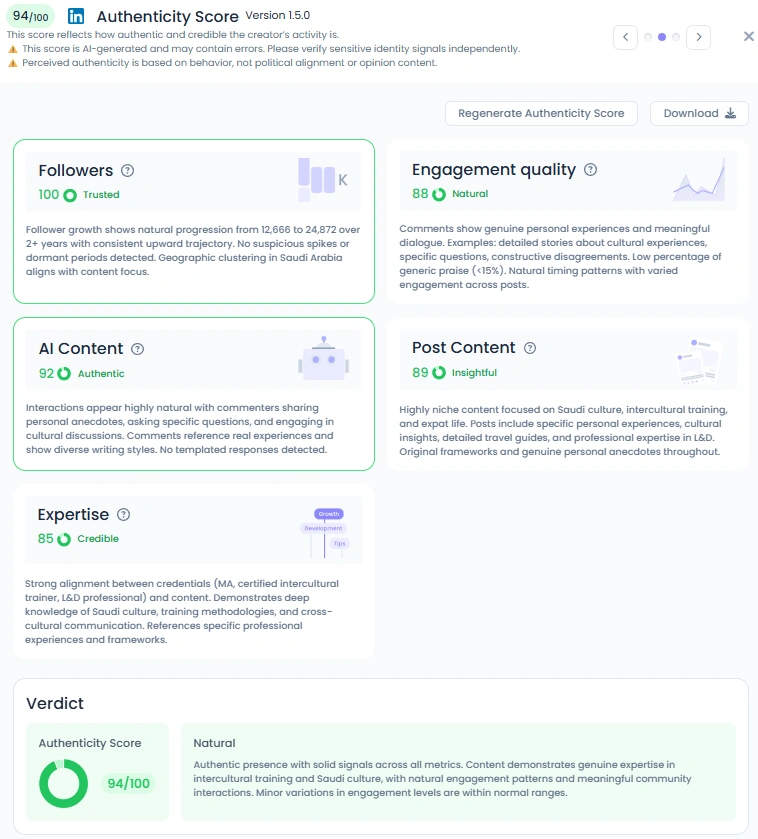 With an excellent Favikon Authenticity Score of 94/100, Cheryl Lynn Obal's presence is unequivocally Natural. She masterfully balances her professional authority with genuine openness by sharing personal anecdotes and photos of her daily life and travels, such as solo travel in the Saudi desert or commuting on the Riyadh metro. Her AI Content score of 92 confirms that her interactions appear highly natural, with commenters sharing personal stories and diverse writing styles. This blend of professionalism and personal reality is key to her high level of community trust.
