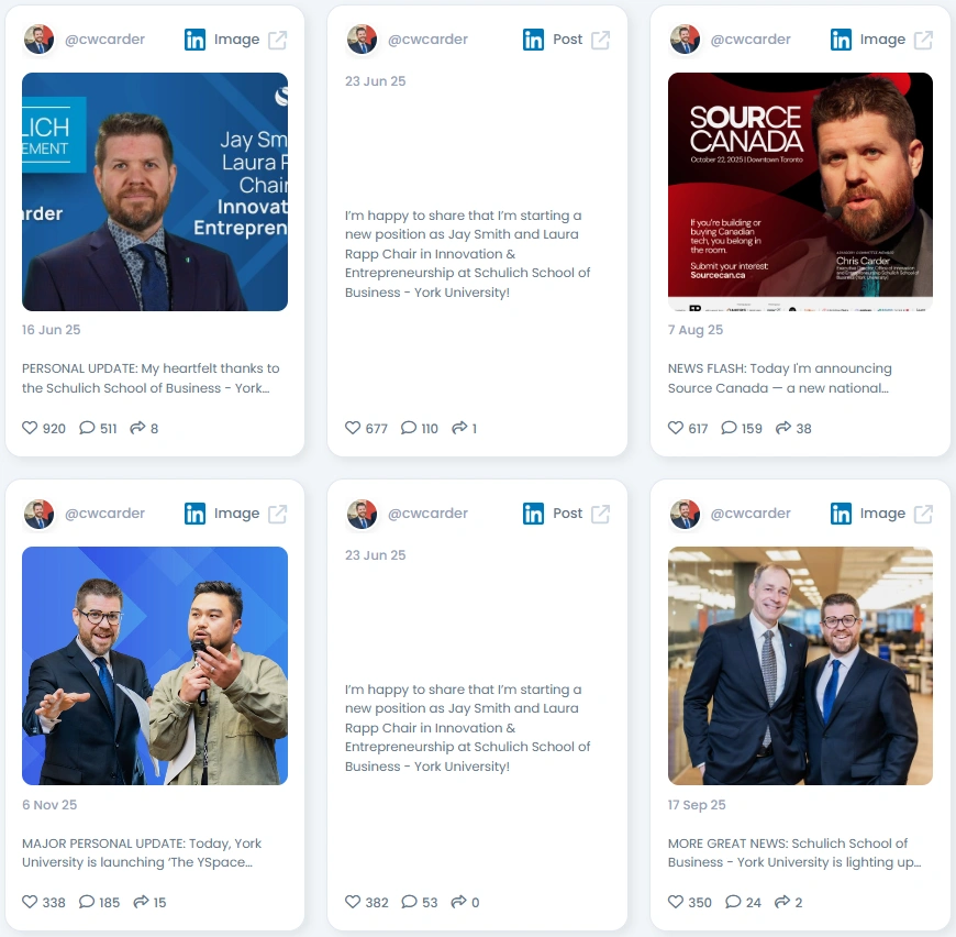 Chris Carder is one of the most recognizable voices in Canada’s startup and innovation ecosystem. He blends academic leadership with real world entrepreneurial experience, giving founders a guide who understands both sides. His posts are full of energy, gratitude, and constant movement. He shares news, people, and ideas that inspire builders across the country.