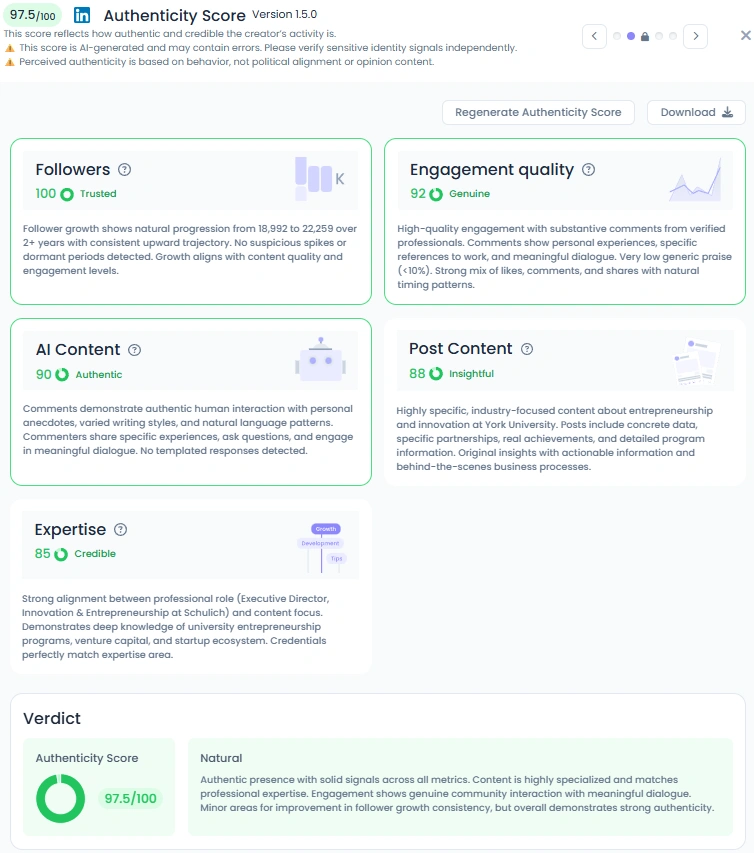 Chris holds a 97.5 out of 100 Favikon Authenticity Score, which reflects how naturally he engages with his community. His comments show real conversations, personal anecdotes, and specific references to projects. His posts often feature photos with colleagues, program participants, and event partners. He appears approachable, supportive, and grateful, which strengthens trust. This authenticity helps his message travel far within the Canadian startup community.