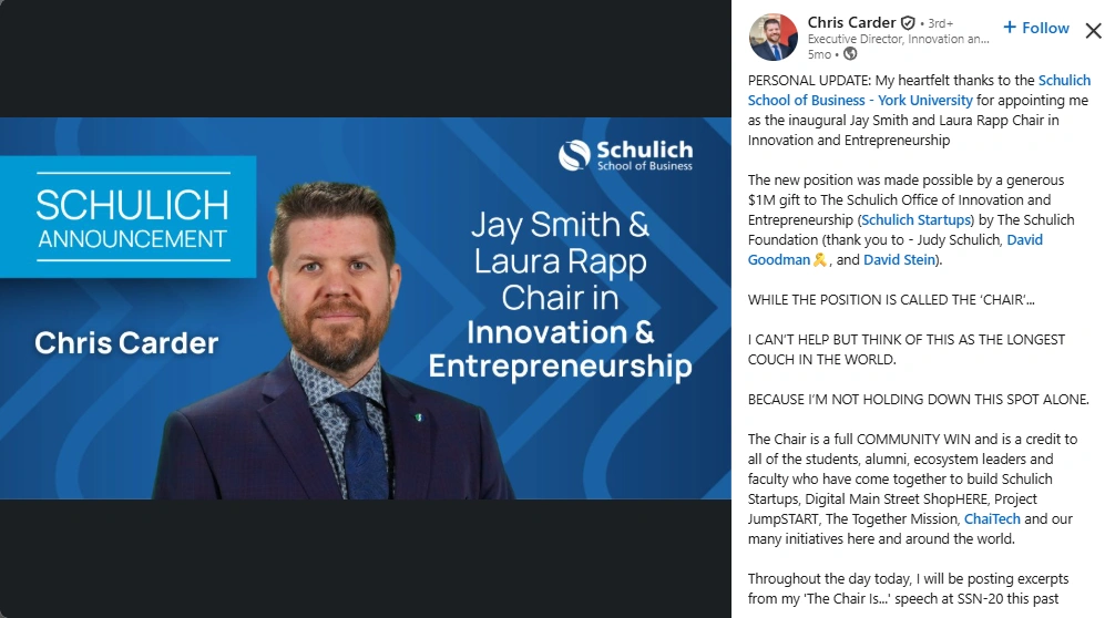 Chris collaborates with York University, Schulich School of Business, YSpace, MaRS, and other Canadian innovation hubs. He works directly with founders, startup programs, and entrepreneurship networks. His content highlights events, new initiatives, strategic partnerships, and program launches. These collaborations make him a trusted connector between education and industry.