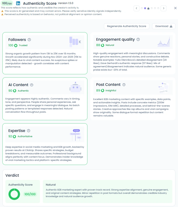 Chris holds a Favikon Authenticity Score of 100/100, backed by a fully organic following and high-quality engagement. His content stands out for its honesty, clarity, and human touch. He isn’t afraid to share failures, lessons learned, or unconventional takes on marketing data. Comments under his posts are full of real conversations between marketers, founders, and creatives who genuinely want to learn. His blend of humor and practicality makes him relatable to both corporate teams and solo creators.