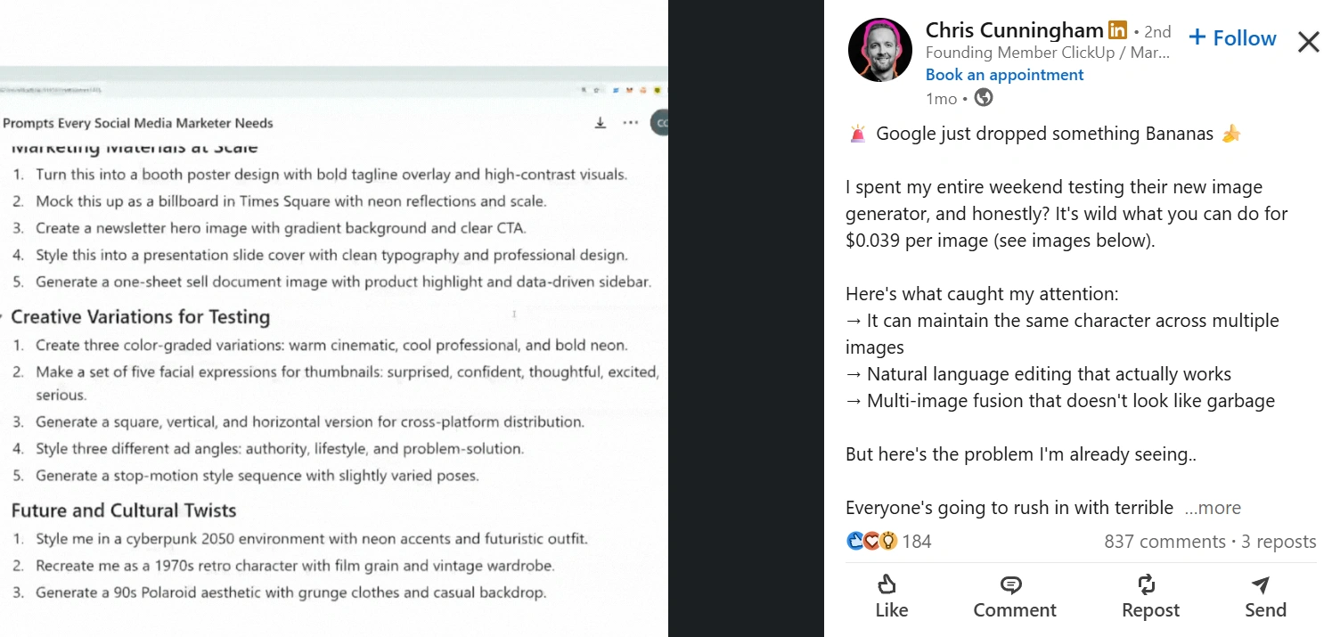 Chris writes like a friend who’s figured out the secret to making marketing fun again. His posts are conversational, often built around mini case studies, creative frameworks, or bold experiments that challenge traditional marketing playbooks. He doesn’t gatekeep strategies. Instead, he explains how ClickUp achieved 150 million monthly impressions, why attribution doesn’t always matter, and how small creative risks can unlock major results. His tone is smart but approachable, making even technical marketing discussions feel like casual brainstorming sessions.