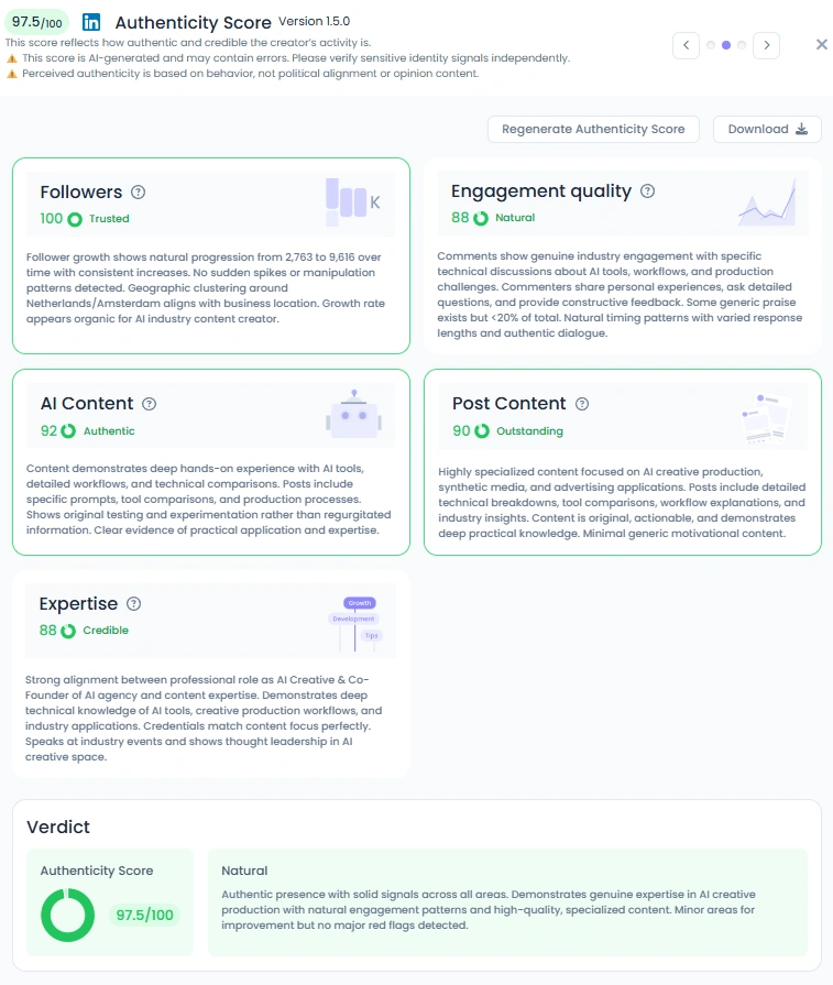 Favikon scores her at 97.5/100 on authenticity. Comments read like shop talk from people who actually produce work. You see technical questions, workflow debates, and healthy disagreements. She is comfortable saying “this looks great but is not production ready yet,” which keeps trust high.