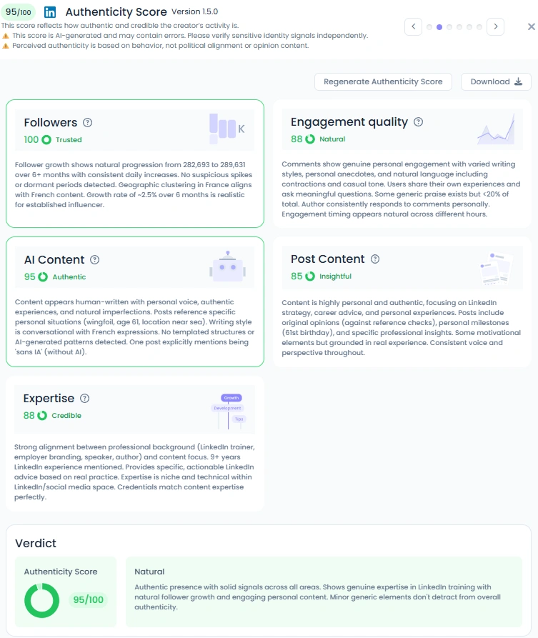 Favikon rates her 95/100 for Authenticity. Comments show real conversations with personal stories and thank-yous from people who found work. Her style is proudly human with phone photos, handwritten signs, and life updates. She answers often and keeps the door open for follow up.