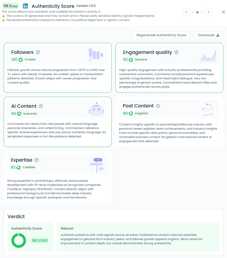 Cindy scores 98.5/100 on Favikon’s Authenticity metric, reflecting a very genuine and consistent presence. Her feed features candid team moments, career announcements, and on-the-ground event recaps. Comments come from real industry peers and partners who reference shared experiences and concrete collaborations. There’s no templated language, and her posts show real relationships and career milestones rather than hollow promotion.